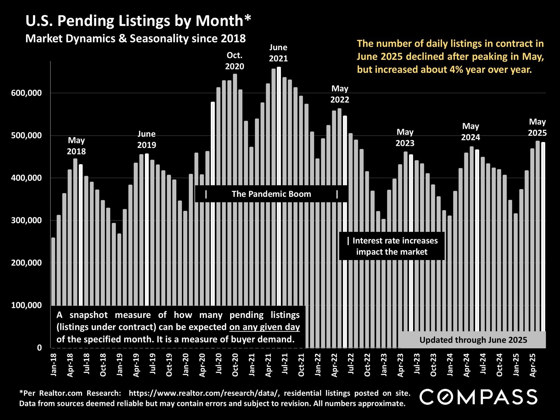 The daily number of listings which have accepted offers - aka listings pending sale, or listings in contract - is a leading indicator of how many sales will close in 3 to 6 weeks. The June 2025 count fell slightly from May, but rose 4% over June 2024.