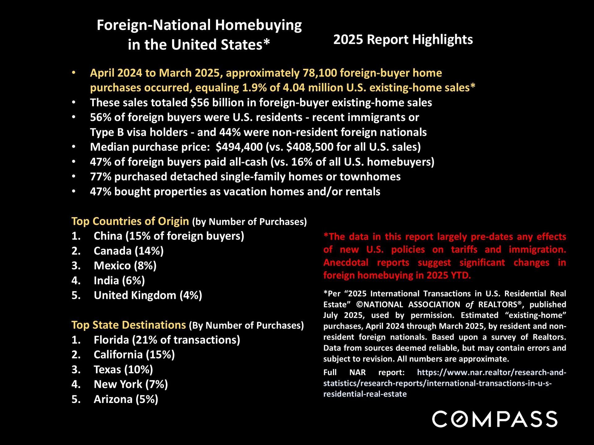 The National Association of Realtors just released their report on foreign-national homebuying in the 12 months through March 2025. International buyers have played large roles in many U.S. markets for years, and in the last period measured, they significantly increased their purchase volume. But this report won't take into account the enormous changes in tariff and immigration policies that have occurred in recent months, and anecdotal reports suggest a substantial impact. As one example, most Canadians have apparently not been pleased by recent tariff threats, much less suggestions that Canada should be absorbed into the U.S.