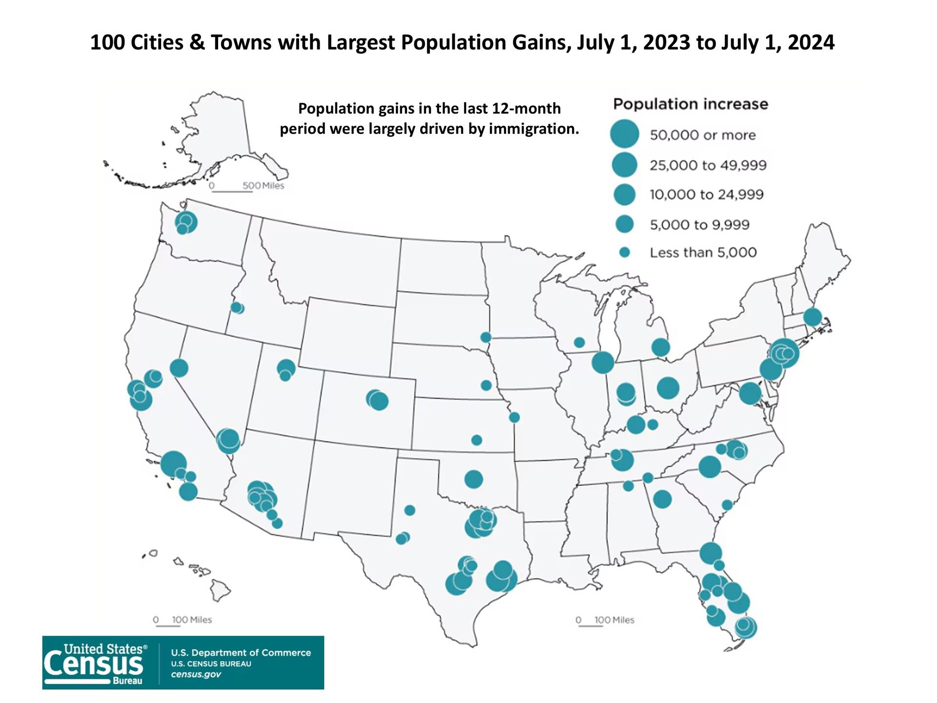 In the last 12-month period measured (through July 1, 2024), population gains were concentrated in urban areas, and mostly driven by immigration. The changes in immigration policies will almost certainly have a substantial impact on this dynamic. Anecdotally, it appears that the quantity of foreign homebuyers is plunging in 2025 due to political considerations, another factor affecting demand in certain markets.
