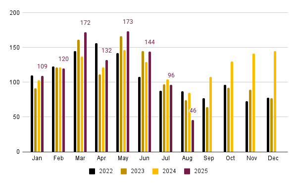 Jan–Jul 2025: 946 contracts signed. That is up nearly 10% from 2024, and ahead of 2022 and 2023.