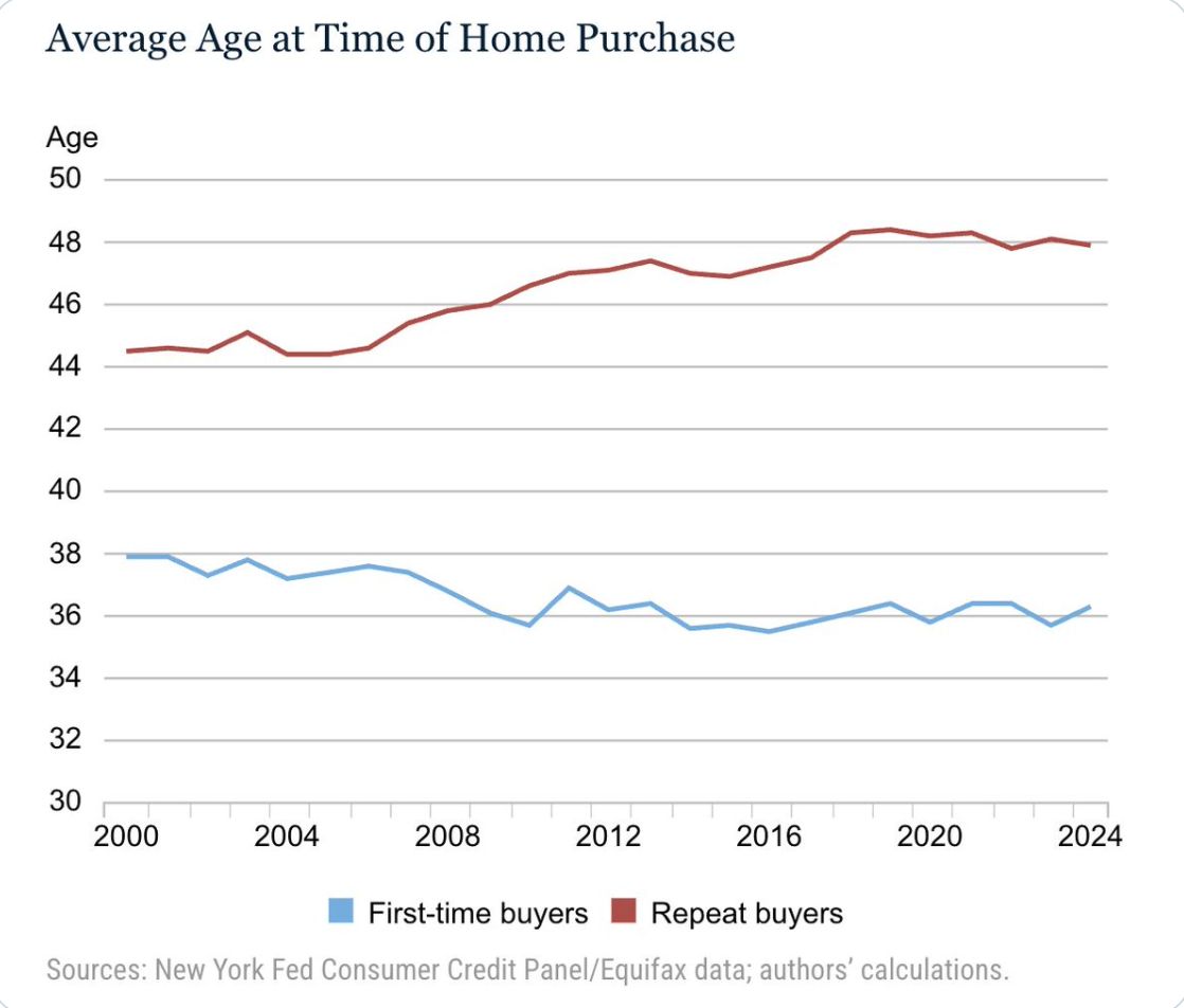 When you really look at the data, the story becomes much clearer. The average first-time buyer today is roughly the same age as, or slightly younger than, the average first-time buyer 15 to 20 years ago — about 36. That stability surprised me when I first dug in. Meanwhile, repeat buyers have gotten older and older, which makes sense: they’ve built equity, they can trade up, and they can move even in a tough market.